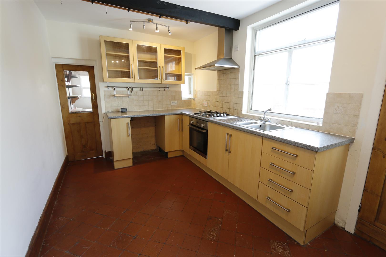 Fitted kitchen with a range of base and eye level unit with roll top work surfaces, one and a half stainless steel sink unit with mixer tap, tiled splash back, integrated electric oven with gas hob over and stainless steel chimney hood, tiled floor.