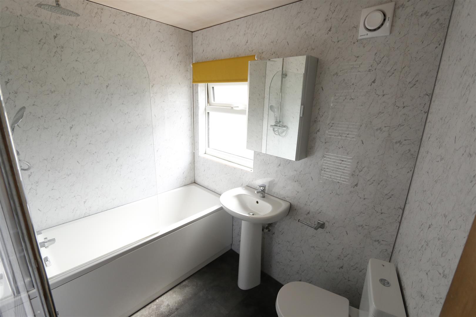 White suite comprising of panel enclosed bath with mixer tap and wall mounted shower, glass shower screen, low level w.c, wash hand basin, heated towel rail, window to rear.