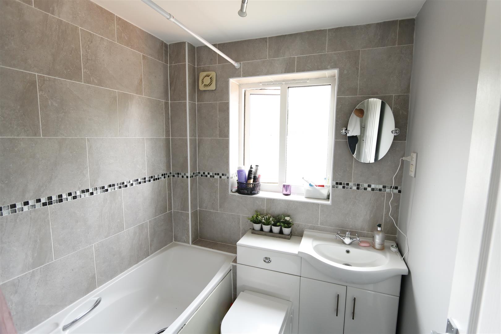 White suite comprising of panel enclosed bath with shower over, low level w.c and wash hand basin in vanity unit, part tiled walls, radiator, window to rear.