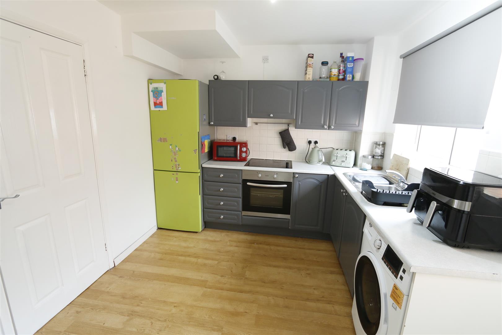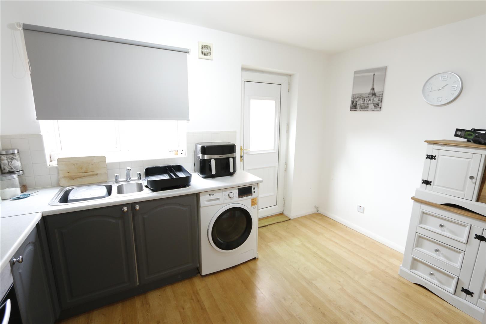 Fitted kitchen with a range of base and eye level units with roll top work surfaces, stainless steel sink unit with mixer tap, tiled splash back, integrated oven and hob, plumbing for washing machine, window and door to garden.