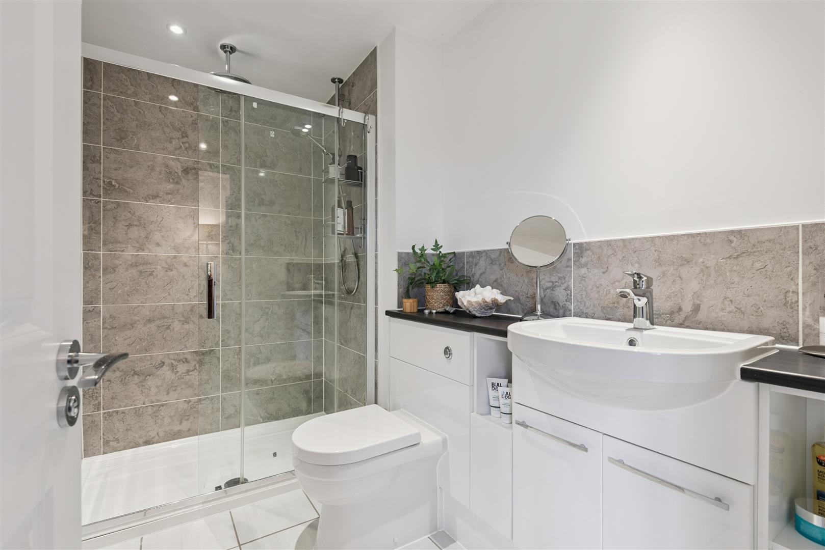 A white suite comprising of a fully tiled, double, shower unit with wall mounted shower and ceiling mounted shower head, low level w.c and wash hand basin in vanity unit with tiled splash back, tiled floor, heated towel rail, inset spotlights.