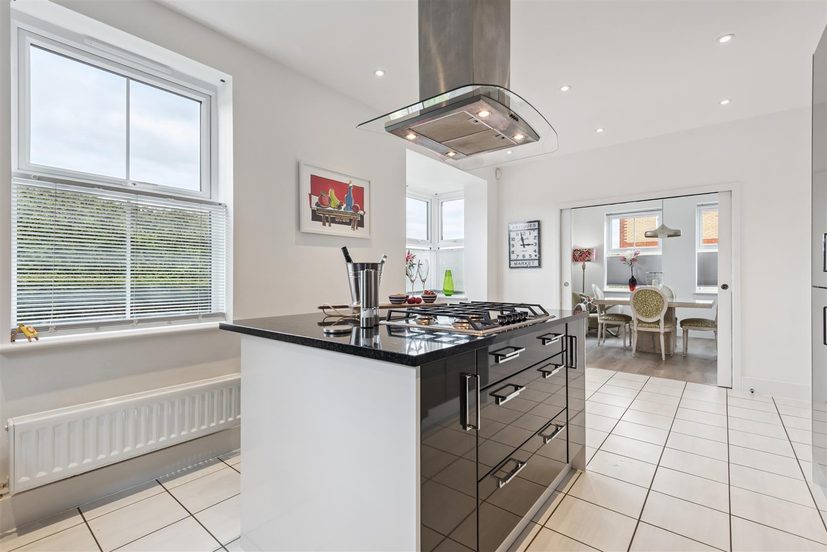 A spacious, dual aspect room with box bay window to side and window to rear, kitchen fitted with a range of base and eye level units with granite top work surfaces and matching upstands, inset sink unit with mixer tap, integrated appliances including eye