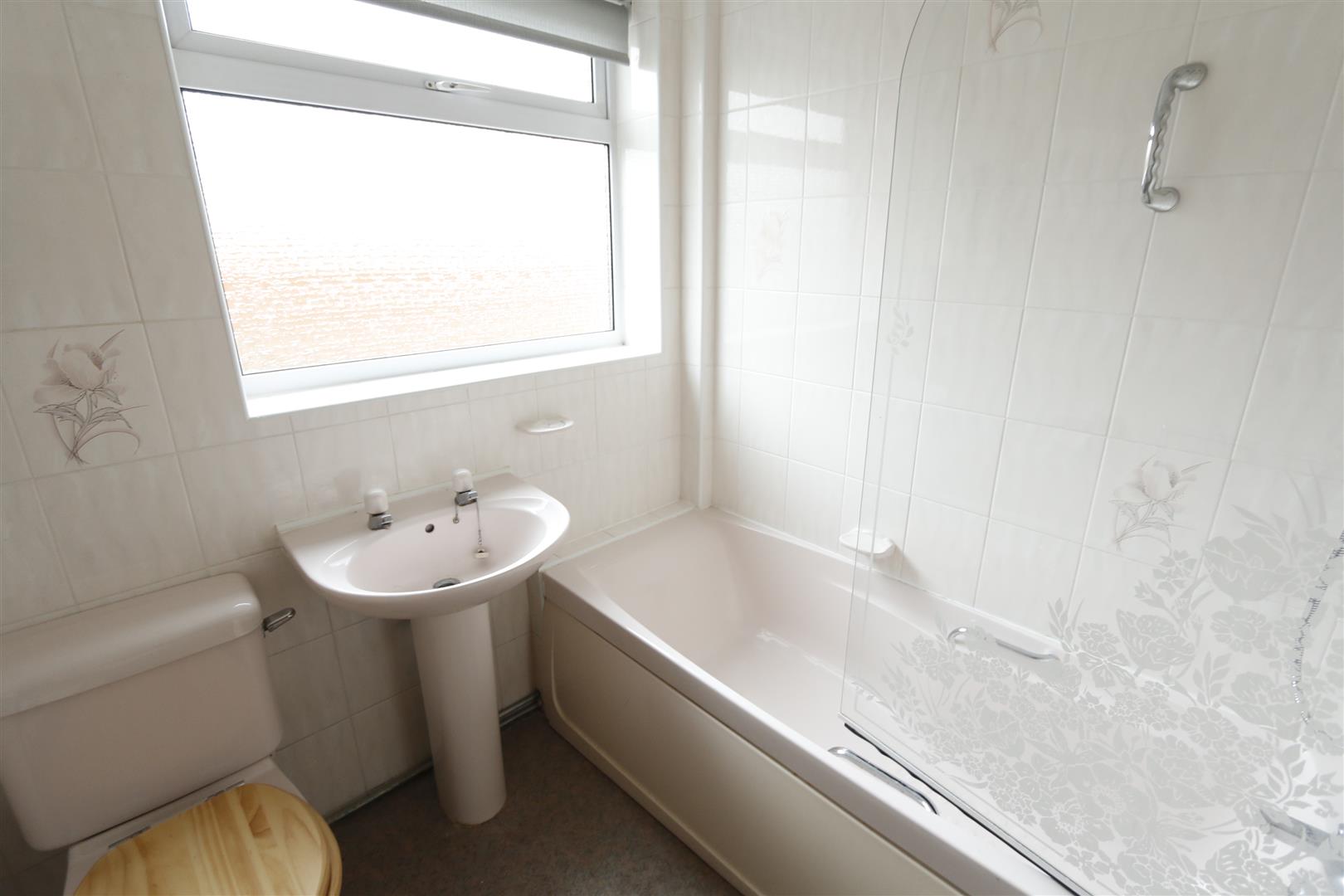 Suite comprising of panel enclosed bath with mixer tap and wall mounted shower attachment, glass shower screen, low level w.c, pedestal wash hand basin, fully tiled walls, radiator, window to side.