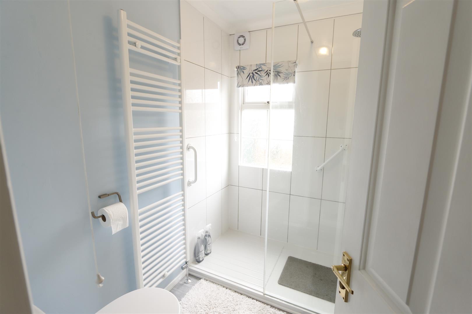 A modern, refitted suite comprising of fully enclosed shower cubicle, low level w.c and wash hand basin in vanity unit, radiator, window to front.