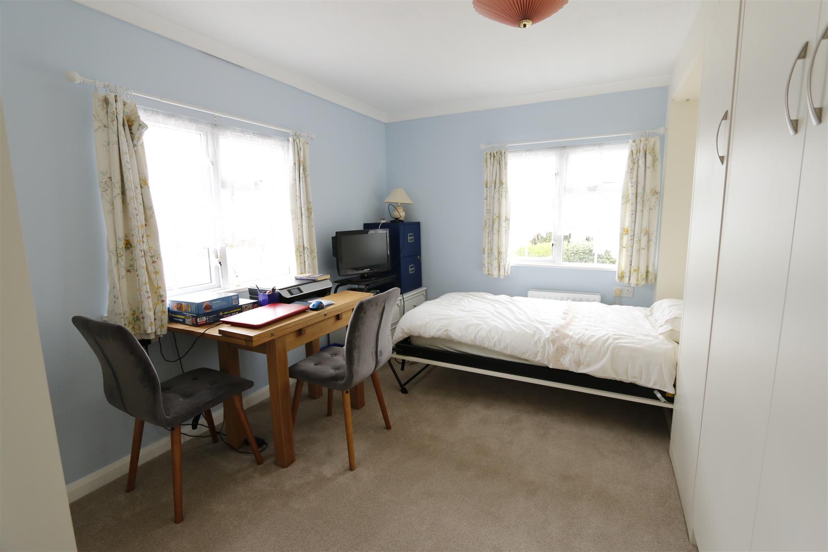 Dual aspect room with windows to side and rear, radiator, fitted cupboards with built in fold down beds.