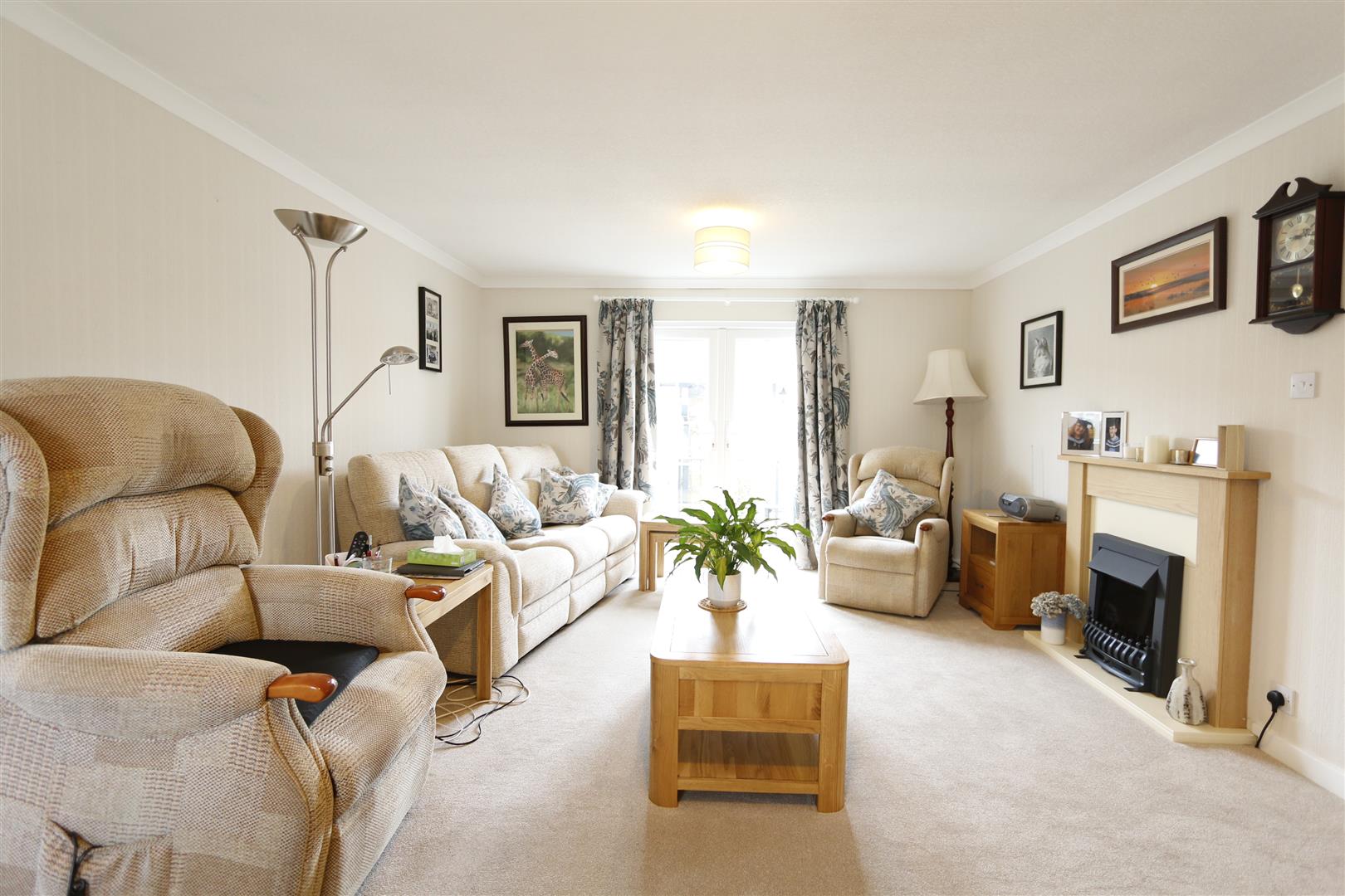 French doors to garden, window to front, electric fire with wooden surround, two radiators.