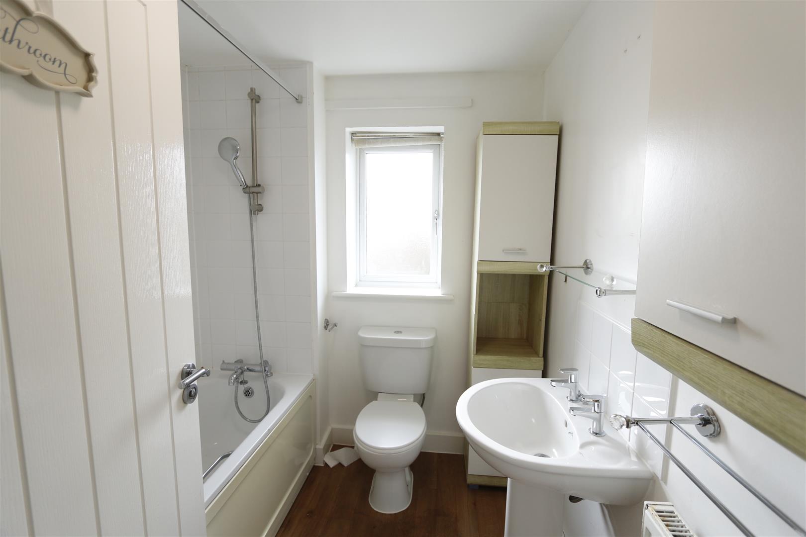 White suite comprising of panel enclosed bath with mixer tap and wall mounted shower attachment, part tiled walls, low level w.c, pedestal wash hand basin, radiator, window to rear.