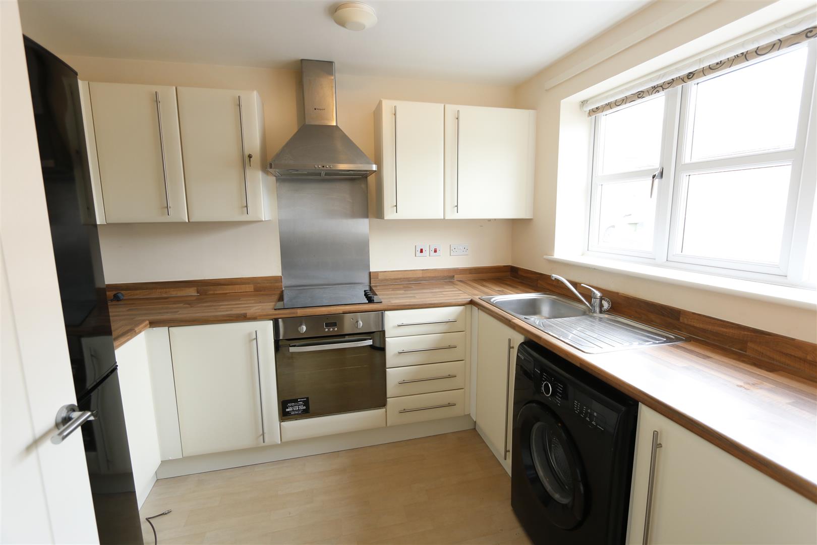 Fitted kitchen with a range of base and eye level units with roll top work surfaces, stainless steel sink unit with mixer tap, integrated oven, hob with extractor hood over, plumbing for washing machine, window to front.