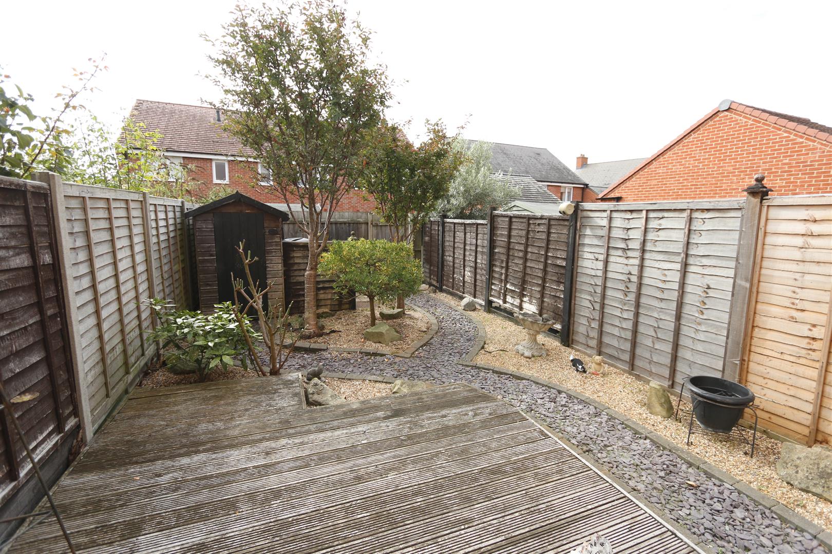 A fully enclosed garden with raised decked area, rest laid to decorative stone,