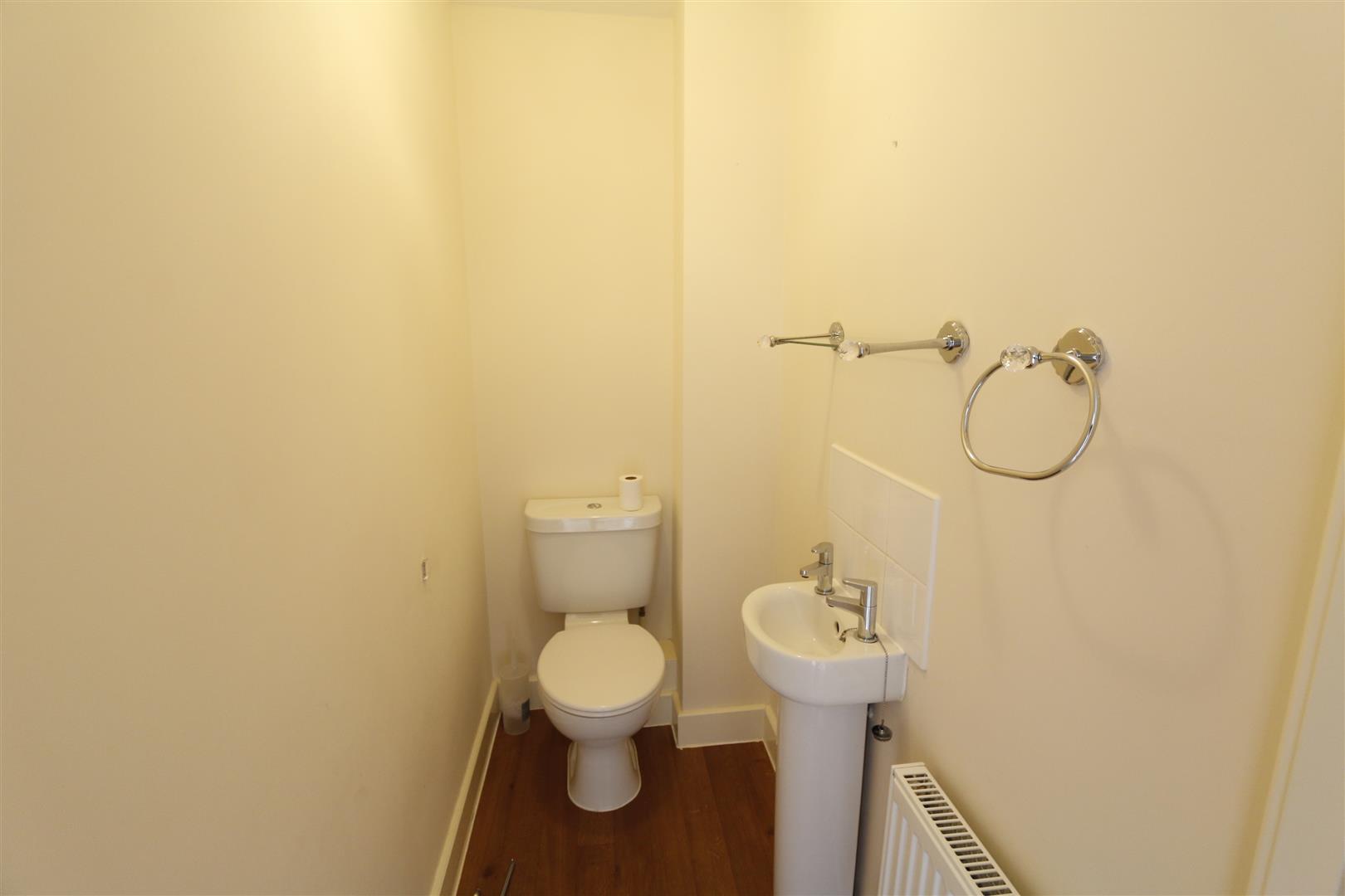 White suite comprising of low level w.c, wash hand basin, radiator.